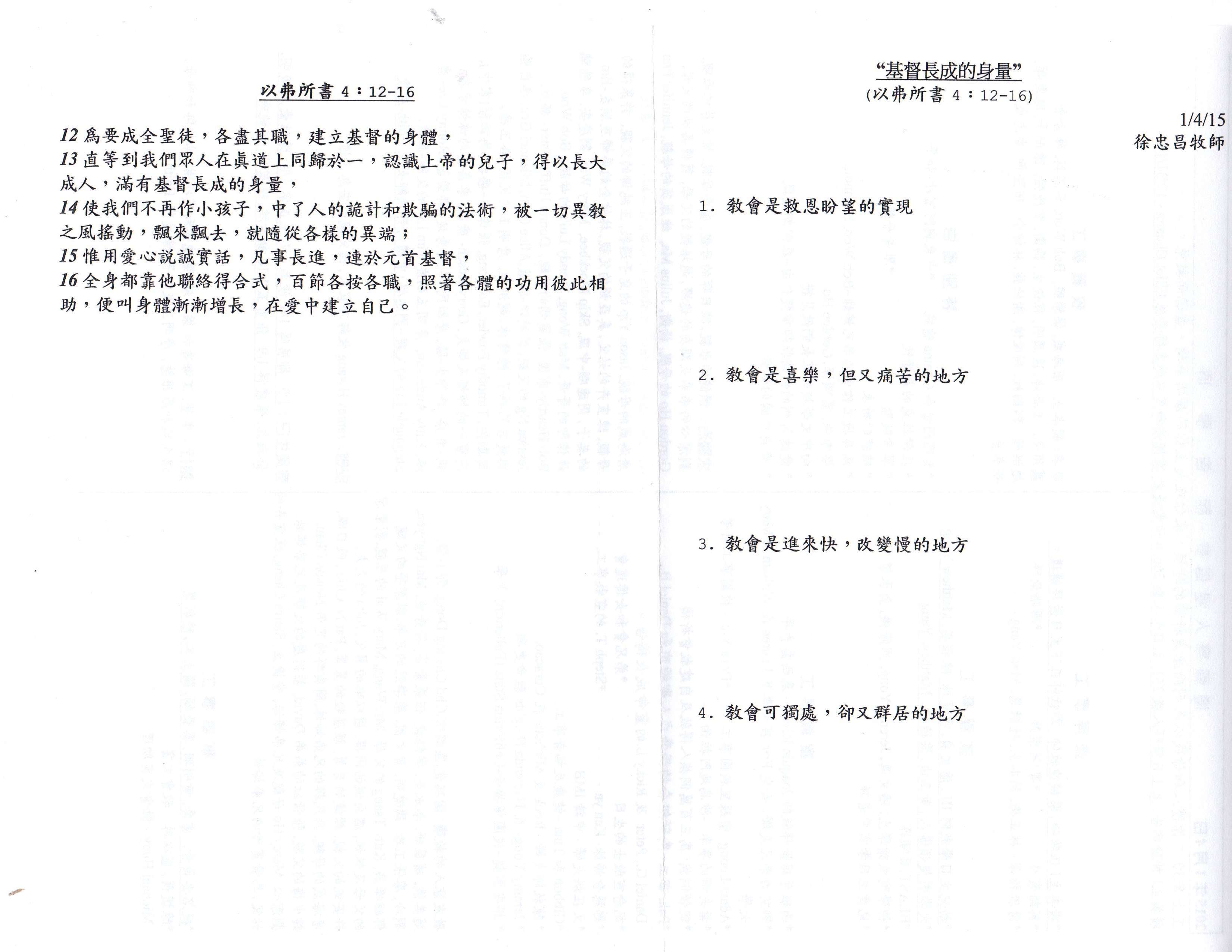 | 1/4/2015 徐忠昌牧師 基督長成的身量 以弗所書4:12-16 |